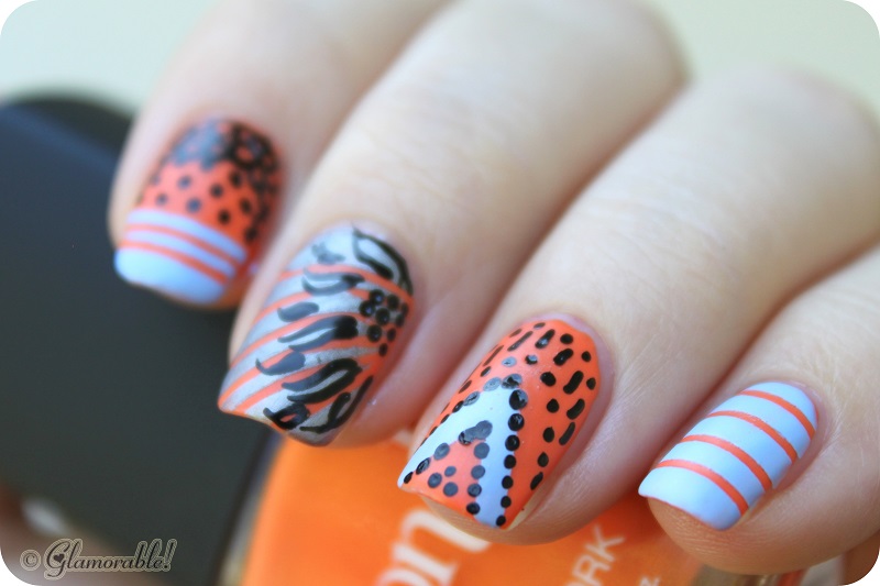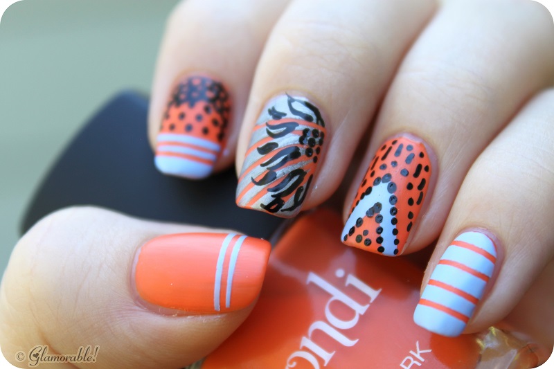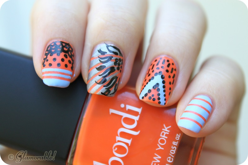 #TGIF At first I thought about drawing some oranges on my nails just to be funny, and then I realized that a lot of people will be doing the same thing. So what I ended up with is basically some matte madness featuring random stripes, dots and flowers all on top of this gorgeous orange base color – Chasing the Sun by Bondi.