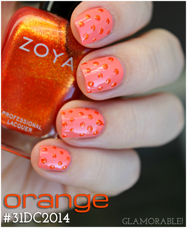 For day two of #31DC2014 we were supposed to come up with some orange manicures. To catch up on this challenge, I did a quick dotticure, using a coral cream base and orange micro glitter, so it turned out to be orange on orange. I actually kind of like this combo, I think it really works here, especially for Summer. Too bad the season for it is already over, or I’d sport it on my toes.