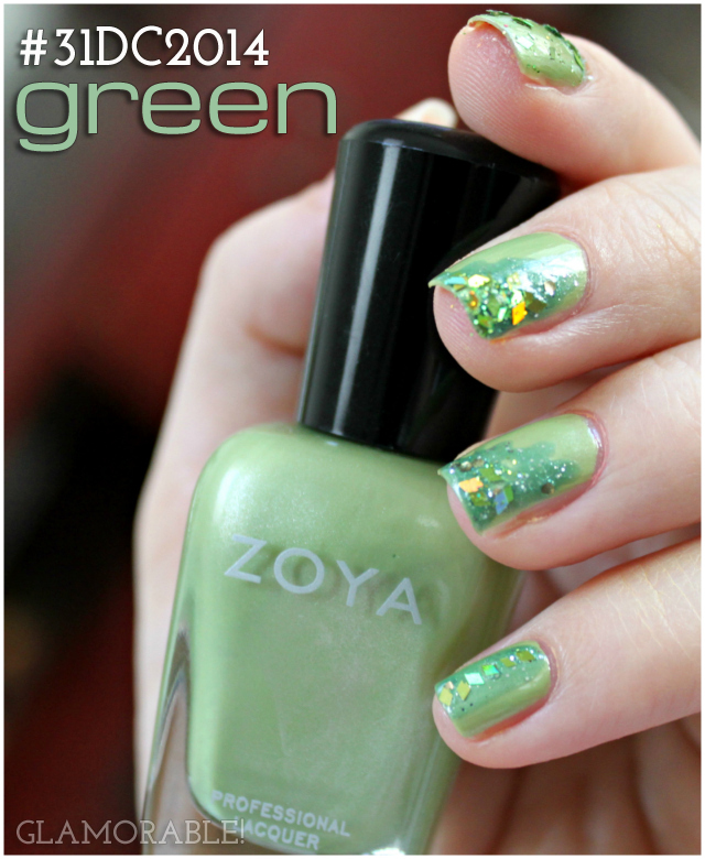 For my #31DC2014 Day 4 entry, which is green by the way, I decided to try something I’ve seen in a tutorial online. The nail artist in the video applied some random splatters on one end of the nail, and then topped them with large chunks of glitter. Hers looked very pretty, mine – not so much. I guess the glitter I have is just not the right kind, so I’ll try this trick again in the future with smaller flecks, and hopefully it goes better.