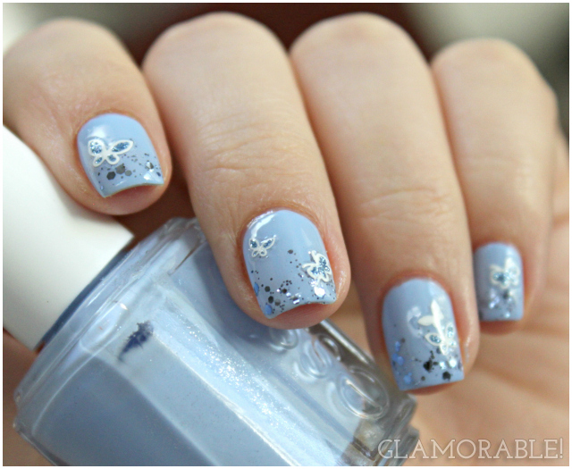 Day five theme of #31DC2014 is Blue, so I prepared this whimsical manicure with glitter, and butterfly decals. At first I wasn’t sure about those decals, but as soon as I applied one on my ring finger, I thought it looked really cute, and added more to other nails, too. I first applied the base color, waited for it to dry thoroughly, then added some glitter along the edges and a few butterflies here and there. It was so easy, anyone can do it!