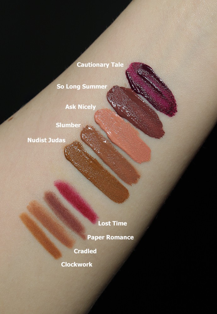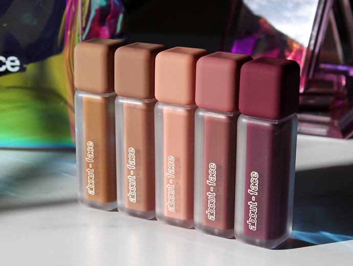 about-face Matte Fluid Eye Paint arm swatches (shades labeled above)
