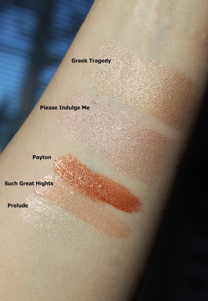 Arm swatches about-face Light Lock Highlight Fluid and Light Lock Powders (shades listed above)