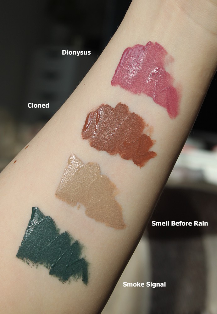 about-face Matte Fluid Eye Paint (L to R): Smell Before Rain, Cloned, Smoke Signal, Dionysus