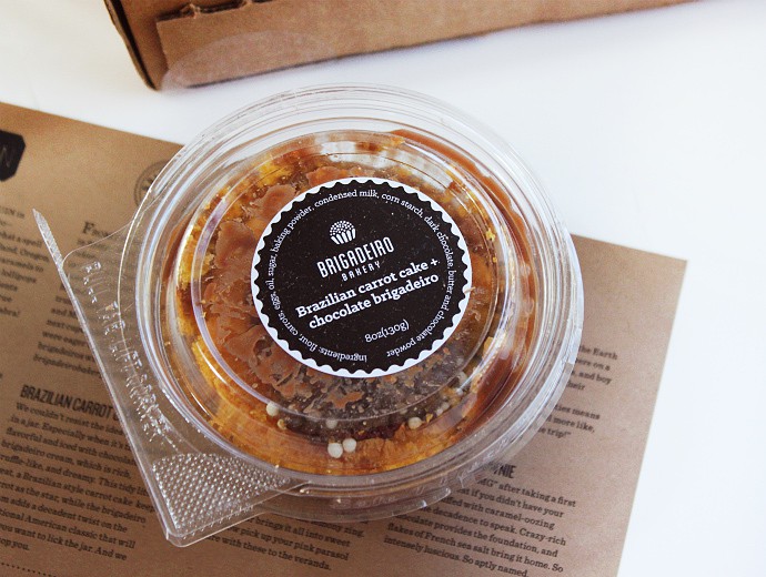 4 // Brigadeiro Bakery Brazilian Carrot Cake ($6 for 1 pc) – Carrot cake is one of my favorite desserts, so I couldn’t believe my eyes when I pulled this giant cup out of the box. Like the cookies, my cake did not enjoy traveling in the back of the UPS truck one bit, and arrived slightly misshapen. The cake was extremely sweet [like, eat sugar by the spoonfuls sweet], so I could only enjoy it with very bitter black tea and unsweetened dark roast coffee. It also was as fresh as it gets. In fact Brigadeiro Bakery recommends eating it within 2 days of receipt, but I took more like 2 hours. 🙂