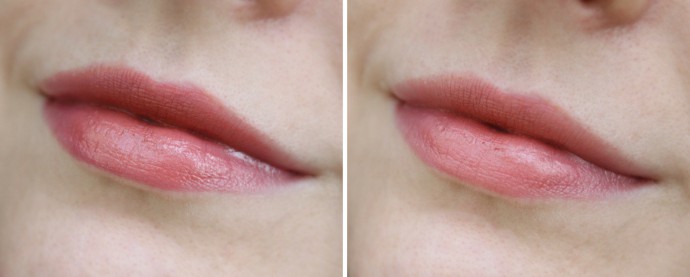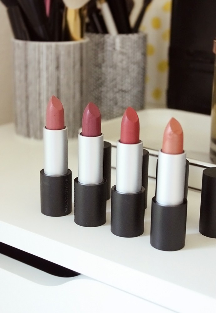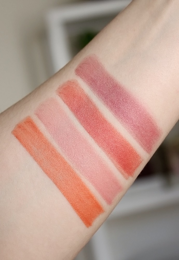 I heard that in the past Au Naturale lipsticks felt a bit dry, but according to a recent comment on the brand’s Instagram they recently reformulated them a little and now the formula is creamier and smoother than before. I can’t comment on the past formula, but the current lipsticks feel nice and balmy. They don’t look too bad on my permanently chapped lips either. The longevity on all four is pretty standard for creamy lipsticks – about 2-3 hours sans eating or drinking before you need to touch up.