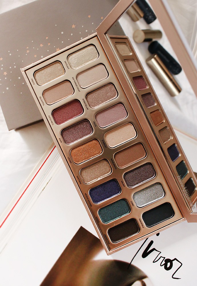 The palette is housed in an off-white textured compact with a nice big mirror. It’s minimalistic and elegant and has a cute design that is appropriate for the season yet doesn’t immediately scream “winter”. The lid features two constellations printed in metallic rose gold, with bareMinerals logo in the bottom right corner. I love how compact it is – there is very little wasted space inside the palette which makes it an ideal companion for traveling. Nice size without sacrificing the abundance of choices? Sign me up!