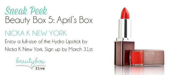 It’s time to reveal the official spoiler for April Beauty Box 5! All subscribers will receive this fabulous Hydro Lipstick by Nicka K. Beauty Box 5 says that “these long-wear lipsticks are formulated with jojoba oil for moisturized, lightweight, full-bodied color. Who can say no to paraben free kisses?”