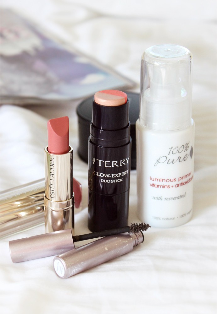 Swatches Top to Bottom: Estee Lauder Pure Color Love Lipstick 430 Crazy Beautiful, BY TERRY Glow-Expert Duo Stick Peachy Petal 3, Le Metier de Beaute Face Kaleidoscope After Dark, Amazing Cosmetics Perfection Stick Fair, Chanel Vitalumiere Aqua Ultra-Light Skin Perfecting Makeup SPF 15 10 Beige, 100% Pure Luminous Primer.