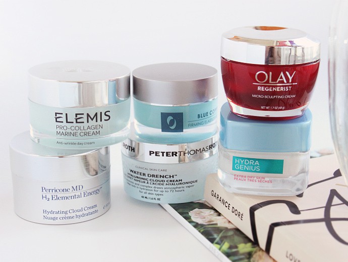 Top to Bottom: Peter Thomas Roth Water Drench Hyaluronic Cloud Cream, Perricone MD H2 Elemental Energy Hydrating Cloud Cream, Osmotics Blue Copper 5 Firming Elasticity Repair, Olay Regenerist Micro-Sculpting Cream, L’Oreal Hydra Genius Daily Liquid Care Extra Dry Skin, Elemis Pro-Collagen Marine Cream.
