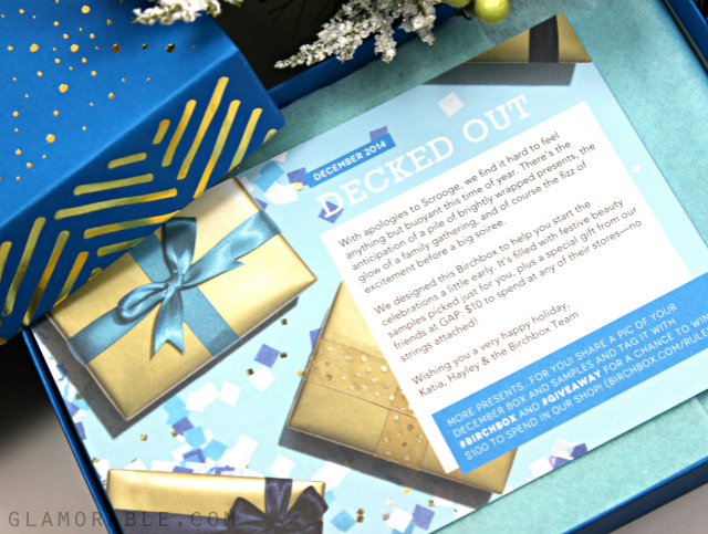 Pretty sure my mind counts the passing of months in Birchboxes, because it didn’t quite settle in my head that it’s really mid-December now [seriously, guys, where has the time gone?]. To make the experience more festive, our samples were packaged in Limited Edition blue Holiday boxes, and as a bonus each subscriber received a $10 GAP gift card [you have to go to a webpage printed on one of the info cards to redeem it]. During the sample choice window for December I selected a rose gold eyeliner from Vasanti, so I knew tht even if the rest of my box ends up being foils of shampoo, I’d still be happy enough. Let’s see what I got!