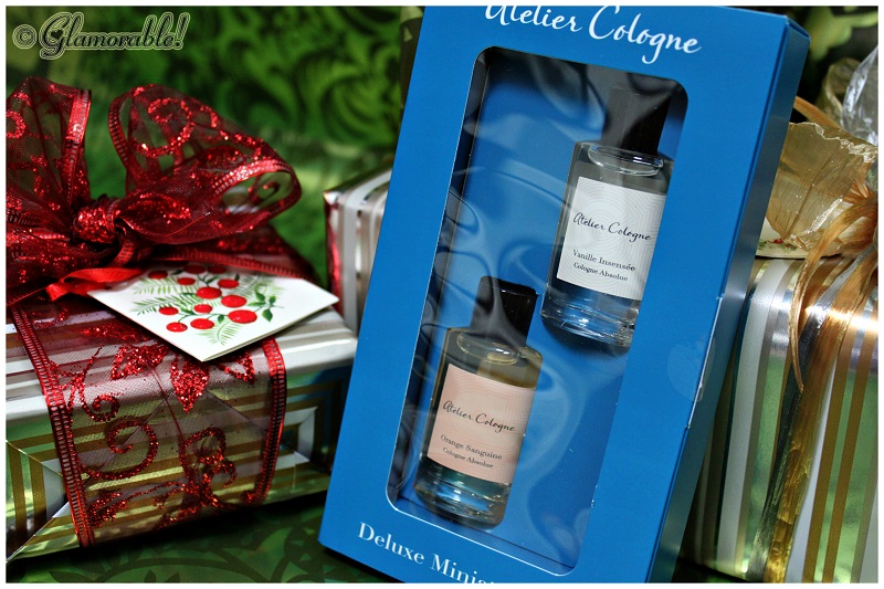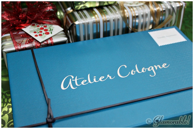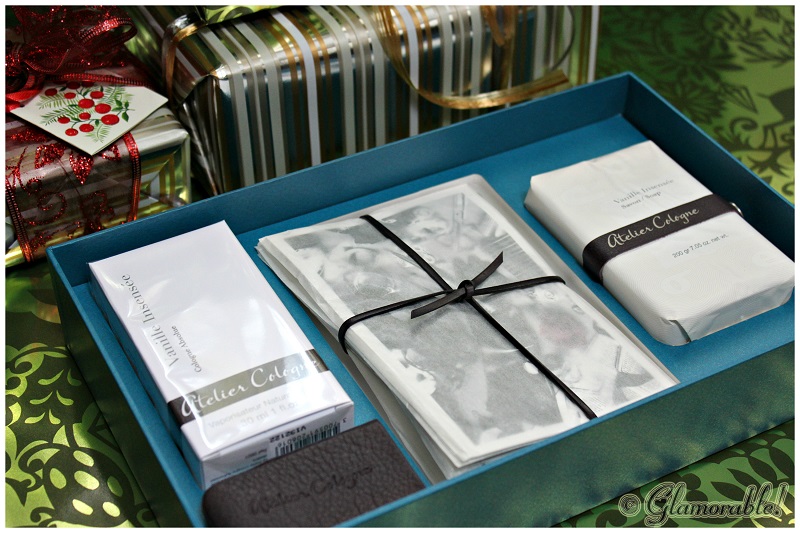 The moment of truth came when I was randomly browsing Birchbox online store to see the Holiday bundles, I was so glad to see Vanille Insensee Gift Set! The set comes with a 1oz bottle of perfume, a purse-friendly leather glove for the bottle, four mini samples of other Atelier Cologne fragrances, and a full-sized bar of vegetable soap; all packaged in a beautiful blue box.