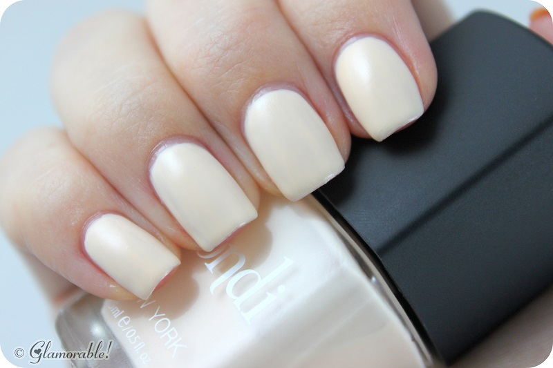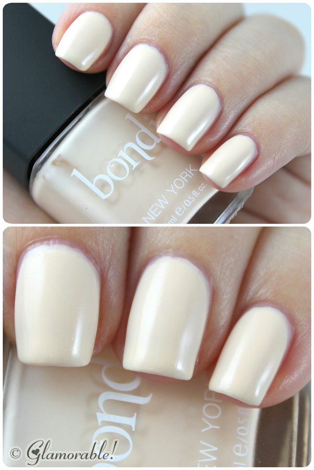 Although it’s described as pink, the polish is actually the color of a french vanilla coffee creamer with very subtle pink hue; it definitely looks more ivory in real life than the picture on Bondi website. I adjusted my monitor’s settings for colors to be true to life, so what I’m seeing in front of me in these swatches is a pretty accurate depiction of this polish, and I hope you all are seeing the same things 🙂
