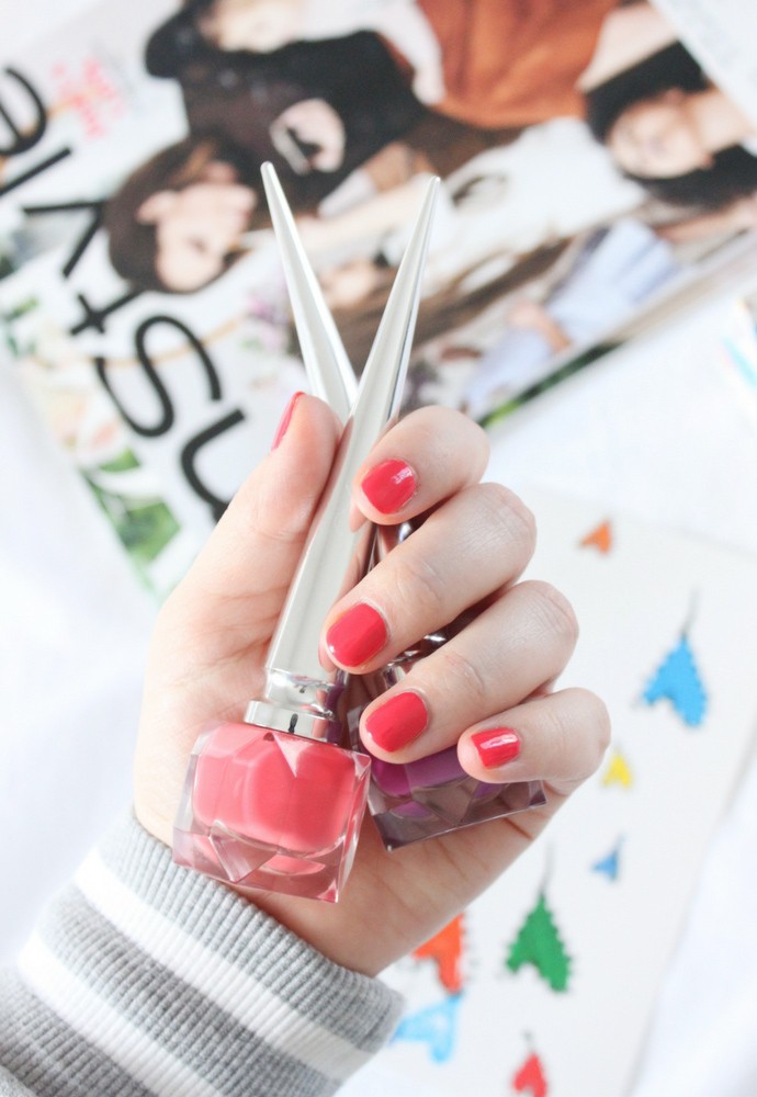 Loubitag Nail Polish Collection is a limited edition release that features three nail polish duos that come in a keepsake box with artwork hand drawn by Christian Louboutin himself. Christian dedicated this collection to his customers who always inspire him to push further while staying true to the core values of the brand. Each box contains two mini bottles from the Pops collection. I chose to try Loubitag II ($60) that comes with Miss Loubi, a ‘vibrant coral pink’, and Bolidonna, a ‘bright berry violet infused with red’.