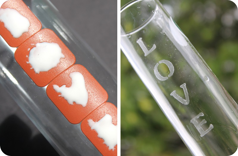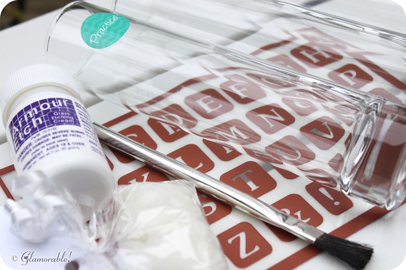 For my test run I picked the corniest word you could think of… that’s right, it’s “LOVE”. I attached the stencils on my practice glass, applied a thick coat of the etching cream with the brush provided in the kit, waited 15 minutes, and washed off the excess with warm water. I had a few stains here and there so I grabbed a dish brush and gently brushed the glass for a more clean and polished look.