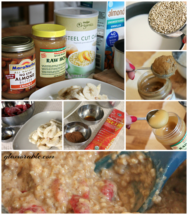 4. When ready, take the saucepan off the burner and stir in chopped banana, almond butter [you can use peanut butter if you like], honey, vanilla extract and cinnamon. If you are using frozen fruit, make sure to add it last.