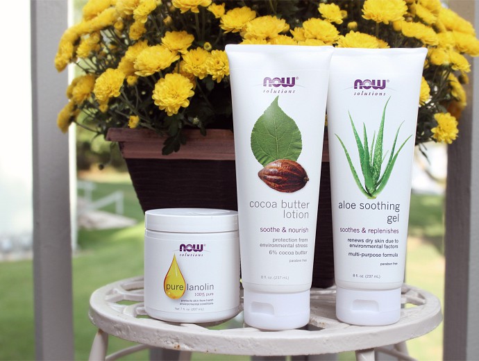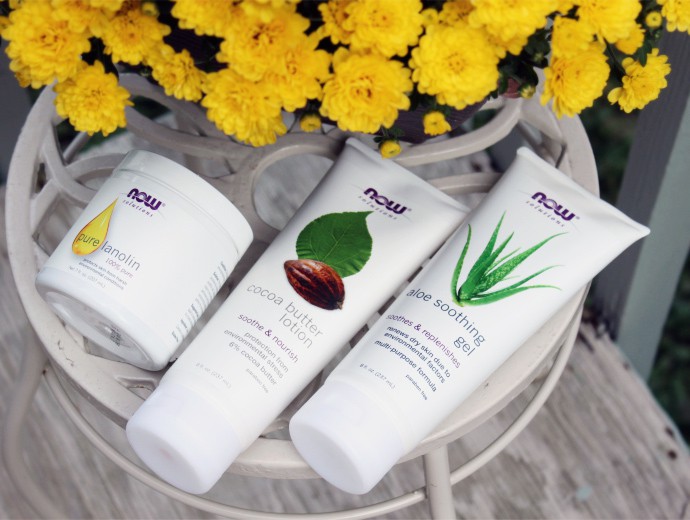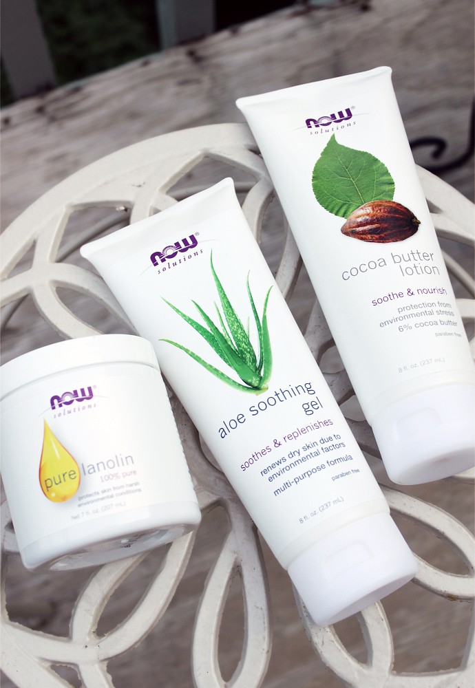 Top to Bottom: NOW® Solutions 100% Pure Lanolin, Aloe Soothing Gel, Cocoa Butter Lotion.