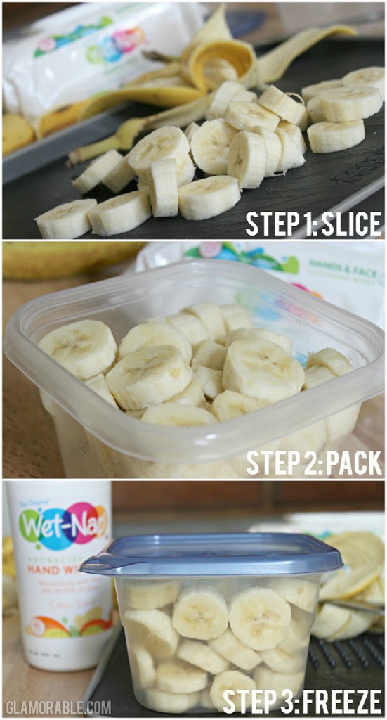 So, from what I gathered online, the first thing we do here is peel and cut our bananas, then freeze them for several hours [ideally overnight] in an airtight plastic bag or a freezable container.