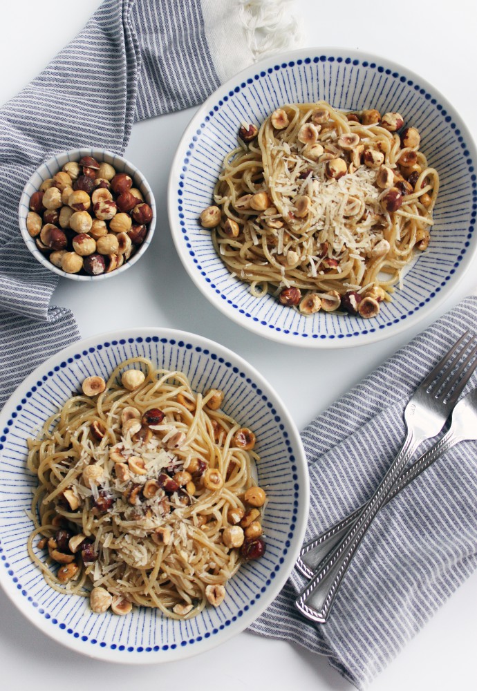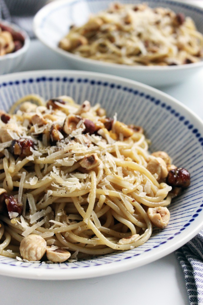 Ok, who here even heard of a dessert pasta? It seems like a novelty thing, akin to dessert sushi or dessert pizza, but trust me, it’s a fantastic dish that will be a complete surprise to the people you cook it for, and you can totally serve it as a main course. This recipe is a modified variation of diós tészta, a Hungarian pasta recipe that uses walnuts and powdered sugar. I first tried making it in high school when I realized that I actually really enjoy the process of cooking at home, and eventually modified it to my own liking, swapping sugar for honey and walnuts for hazelnuts.