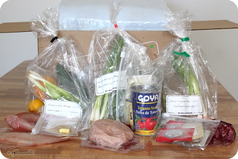 My box contained three dinner recipes, with three plastic bags filled with all ingredients, already measured, and some were even washed and peeled. The meats were packaged in airtight vacuum plastic bags, the sauces and spices were sealed in secure ziploc bags, nothing was spilled or spoiled.