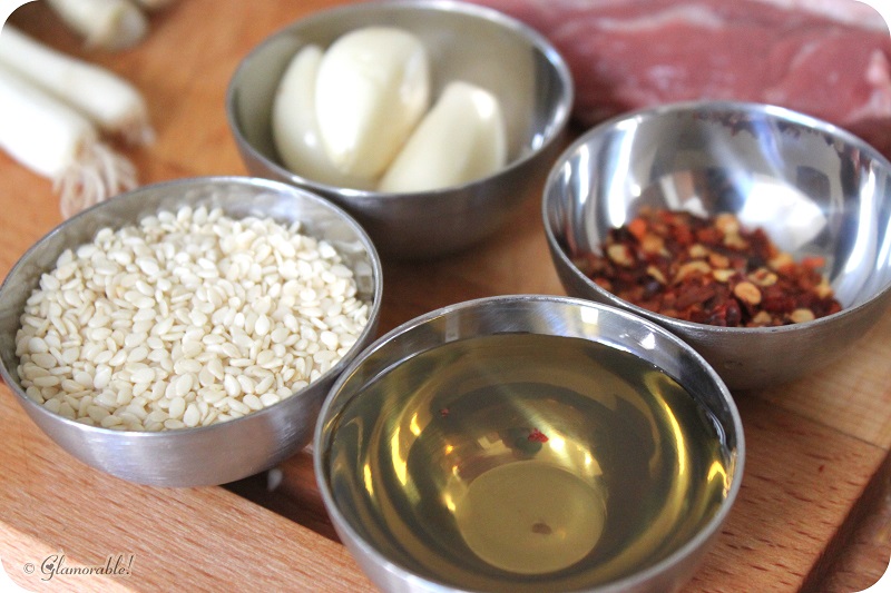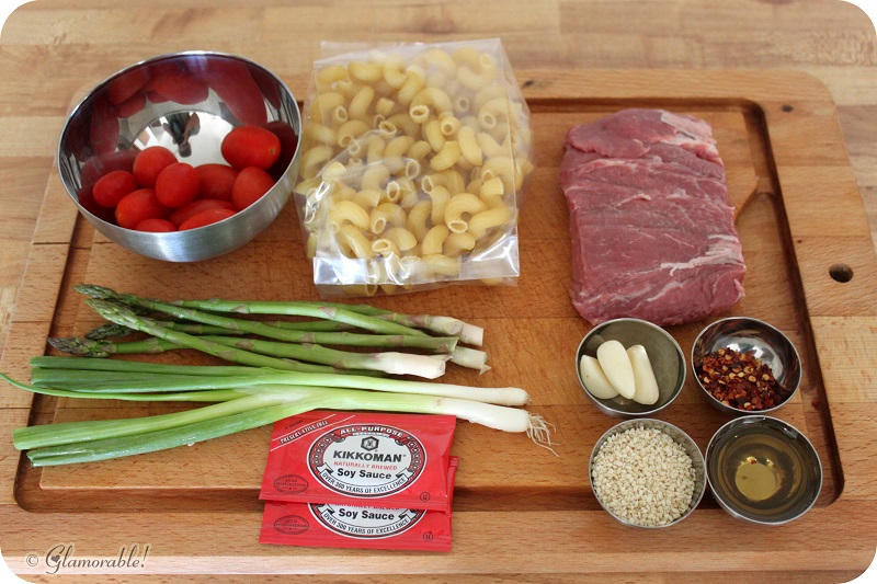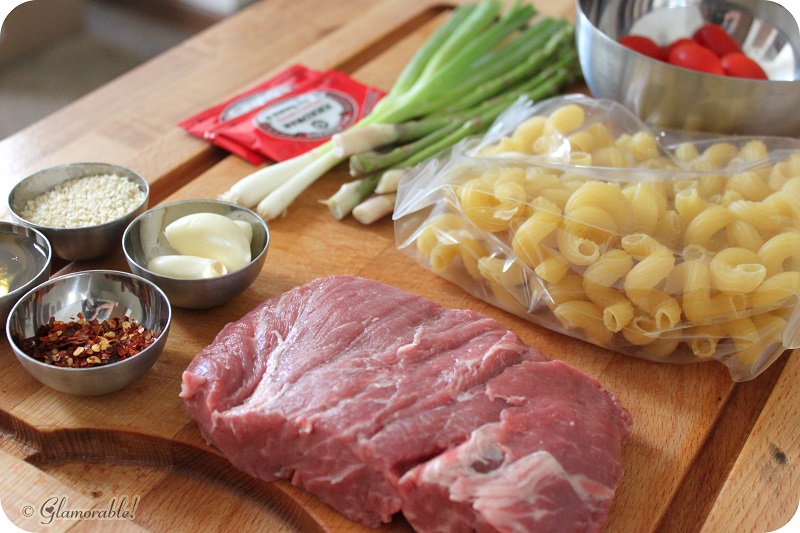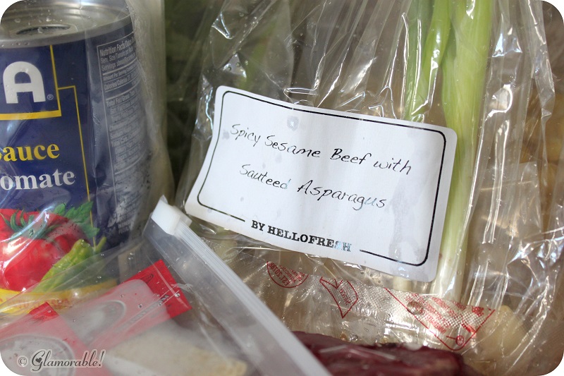 Here are a few pictures of my favorite dish from the selection – Spicy Sesame Beef with Sauteed Asparagus. The package had just enough of everything to make the recipe, plus some extra chili flakes to adjust the spiciness level.