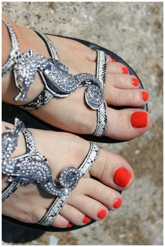 | My summer staple – bright pedi colors. P.S.: Don’t you just love those blingy seahorses? |