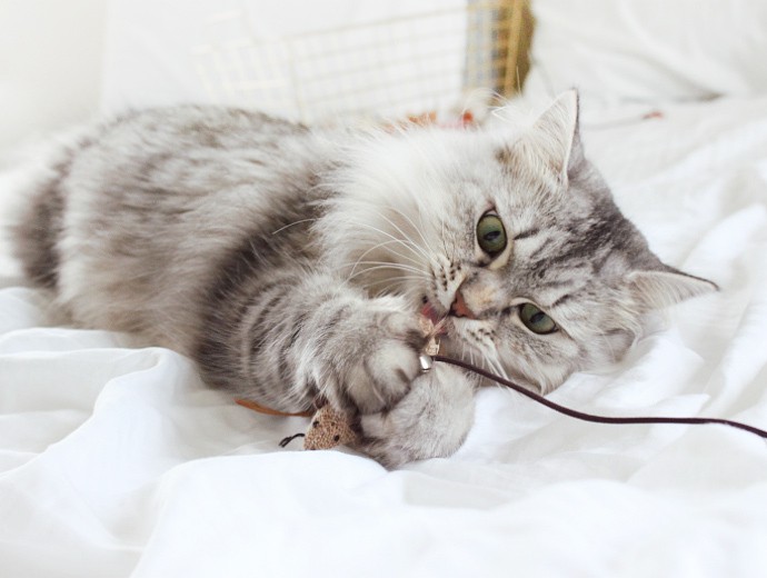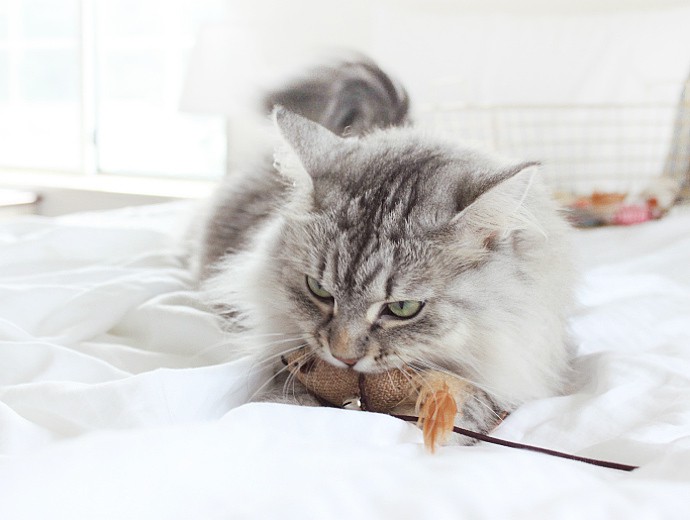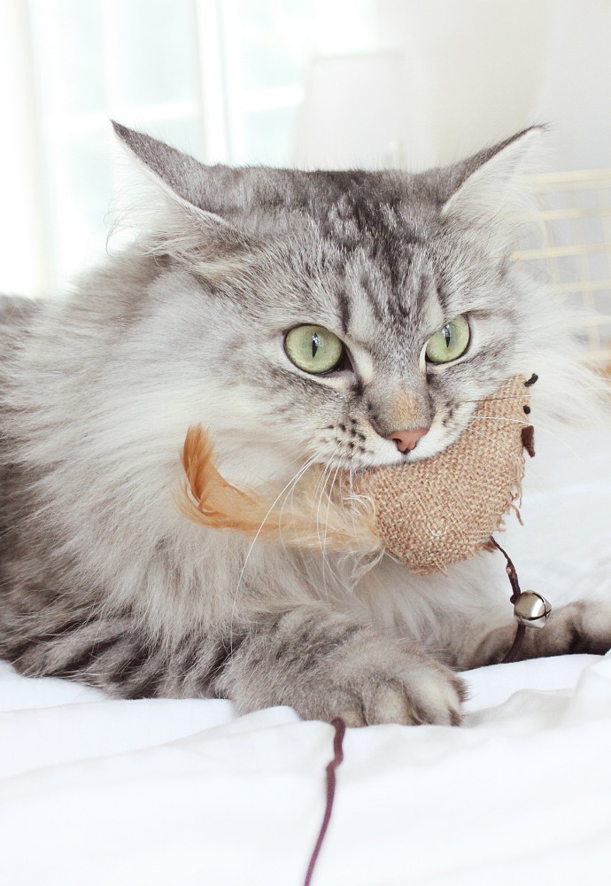 1 // GAMES. Cats love to play! Chasing little objects thrown down the stairs or a dangling plushy on a string is as fun as it is satisfying. Laser pointers are a popular cat’s toy, but they are actually not that great, since your kitty can’t “catch” it, which leads to frustration. A frustrated cat will often sneeze quietly when things don’t go her way. That’s why it’s important to ensure the toys are engaging and satisfying for the cat – she will love anything she can sink her claws and teeth into once it’s caught. By the way, Luna is obsessed with her collection of felt and straw toys that come in various shapes and sizes.
