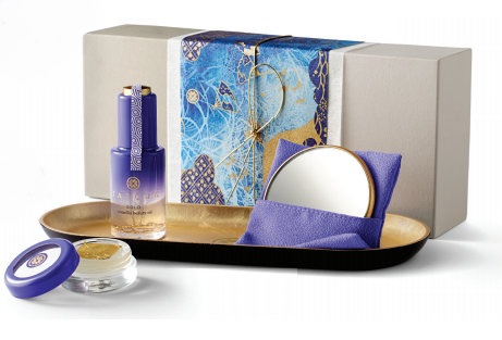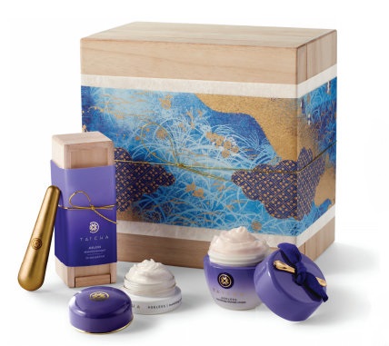 Named after the Japanese word for gorgeous, this set features a 24-karat gold-leafed tray and hand mirror, Camellia Beauty Oil with real gold flakes and Camellia lip balm.