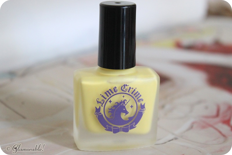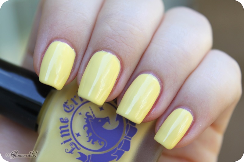 This nail polish was the free monthly referral bonus. I have heard of Lime Crime before but never really cared to try any of their products, especially after I read some gossip about major drama involving the owner of that company. I still don’t intend to buy anything from them, but since I have the polish in my hands I might as well swatch it, right? Crema de Limon is a color from Les Desserts d’Antoinette Collection that features seven pastels with varying finishes – some turn glossy, some don’t. Crema de Limon is described as a pastel yellow creme, and it’s one of the colors that doesn’t turn glossy when it dries, which I was totally fine with because I really like the semi-matte effect. It took a while to dry, but once it did, I had no major chipping problems with it. I wore it for 3 days with zero tip wear and only took it off because I had to swatch something else. All Lime Crime polishes are 3-free, but seems like everything is 3-free these days 🙂