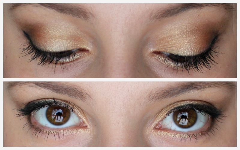 And here’s the swatch of the eye shadow quad and the gel eyeliner. When mixed together these colors look nice and bronzey and not in-your-face yellow at all 🙂