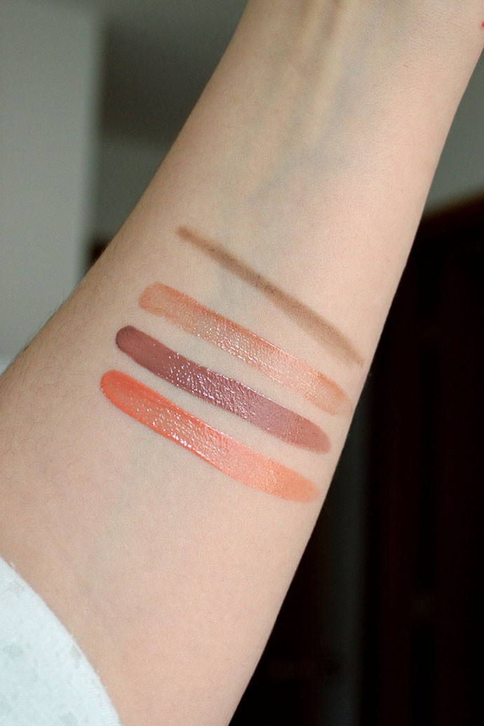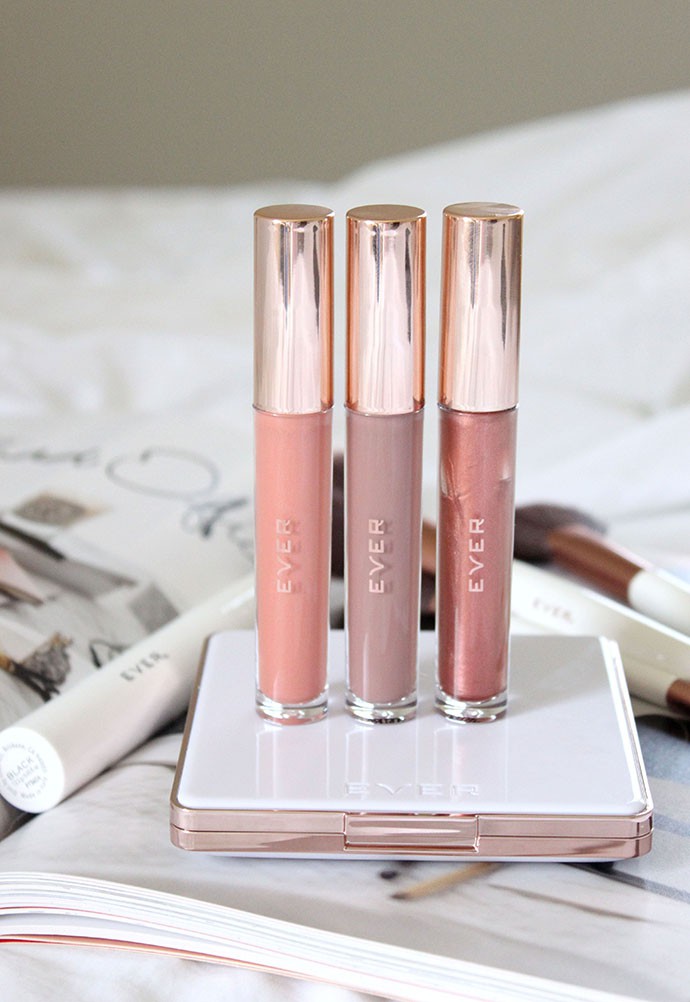 Ever FLASH Power Plumping Lip Gloss in Blush Nude, Cameo Nude, and Sunset Nude; Ever Frame Brow Pencil in Taupe (swatches)