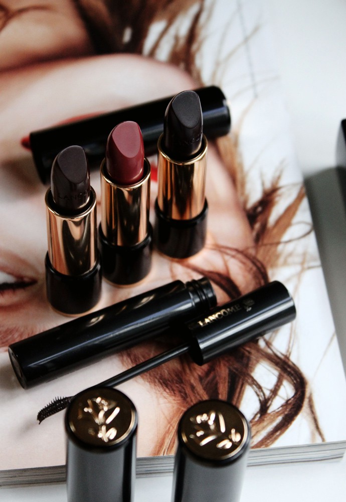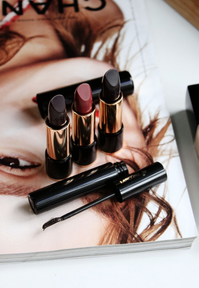 Swatches L to R: Lancome L’Absolu Rouge Hydrating Lipstick 359 Hypnotique, 399 Secrete, 397 Berry Noir; Sourcils Styler Brow Gel 03 Brun; Teint Idole Ultra Long Wear Foundation 090 Ivoire N.