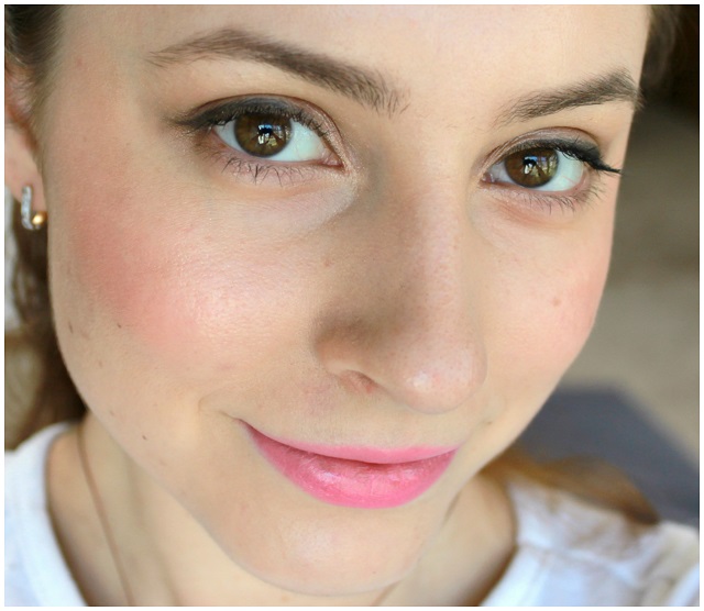 Rosy Rouge is a beautiful true pink rose color, with lightweight, ultrapigmented formula that provides medium-full opacity in just one swipe and sets with glossy satin finish. Lancome promised at least six hours of wear, however, even with minimal eating and drinking, the color wore off after about 5 hours, leaving behind a pink stain. Considering the buttery formula, I honestly expected it to last less than that, so I’m not really complaining.