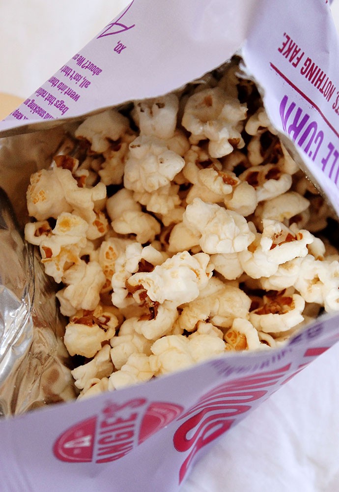 Angie’s Sweet & Salty Popcorn is made with non-GMO corn, and is both vegan-friendly and gluten-free.