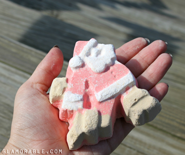 Dashing Santa is a Limited Edition bath bomb [and a brand new never before released product] that is only available as part of Christmas collection. I was intrigued by the promise of fun citrusy sparkles and totally bought into all that glitter [pun totally intended]. This bath bomb is scented with bergamot, mandarin, and orange absolute, and I’ve always associated those notes with Winter Holidays.