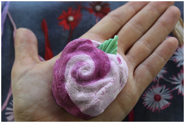 Secret Garden bath bomb almost looks like a kid’s toy, but it’s actually loaded with rose and orange oils, and holds a surprise in its core. What’s the surprise, you ask? A handful of dried flowers, to make the bathtime look like fancy-schmancy SPA ritual! [how fun is that?] Unlike my experience with previous two bath bars, this one didn’t seem to soften my skin at all, but I still had a great time, thanks to its uplifting aroma and that bunch of flowers. The cleanup wasn’t too bad, since most of the flowers ended up right by the drain, so I easily scooped them out.