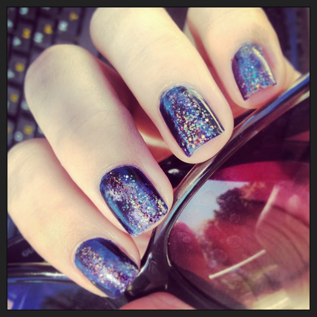 I’m not really qualified to give a tutorial on this, because I was learning myself and this is actually my first attempt, but basically I lightly sponged various shades of blue, pink, and nude nail colors on top of the night sky base, topped them with some glitter, and locked in with a top coat for an even and glossy finish.