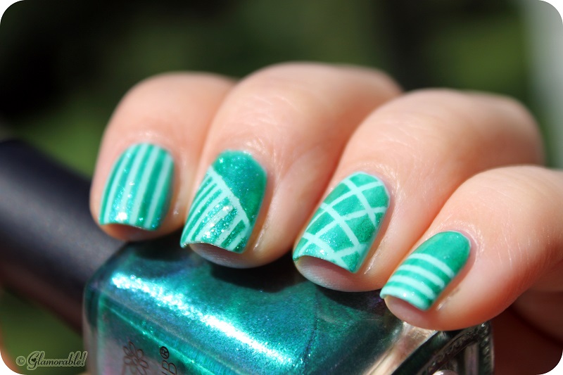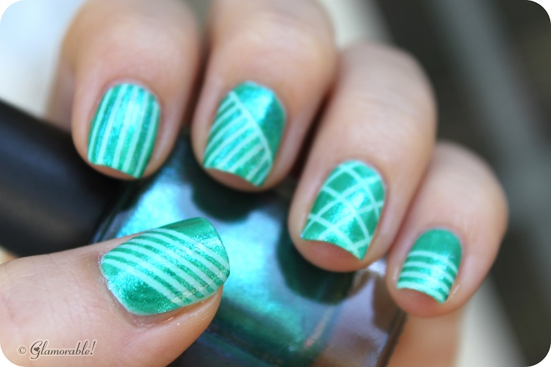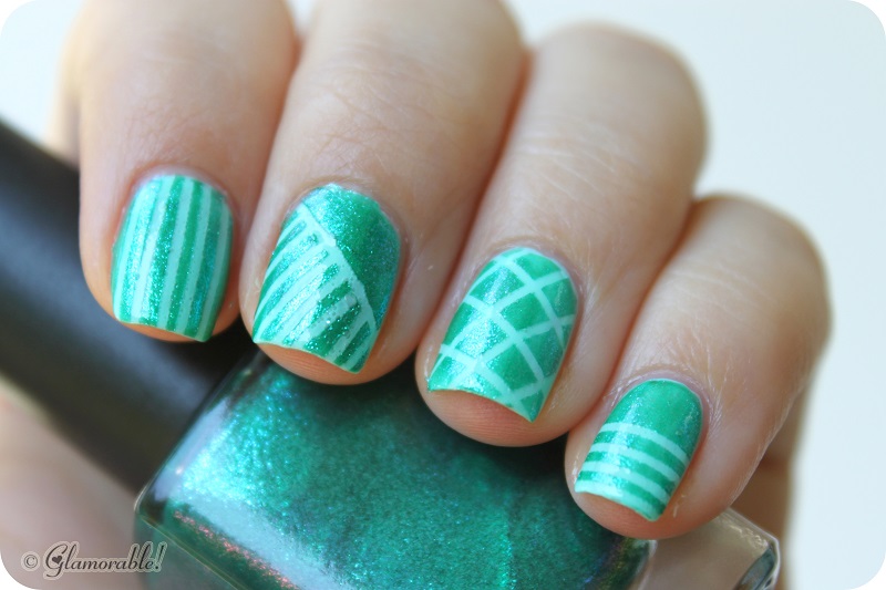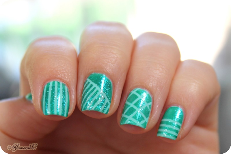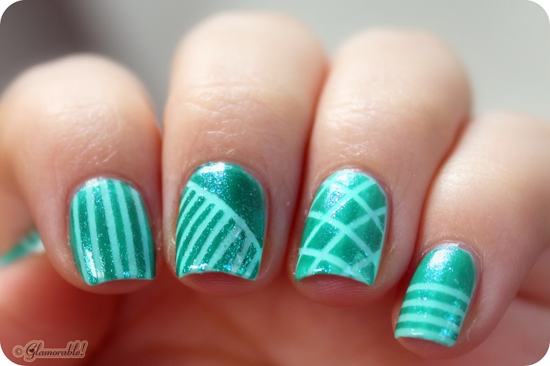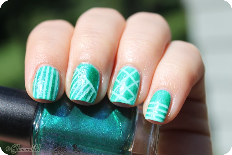 In this manicure I used Color Club Blue-Ming as a base, then lined it with nail tape to form patterns and topped with Color Club Metamorphosis. After that I removed the tape and topped everything with a nice thick coat of Sally Hansen Insta-Dri top coat.