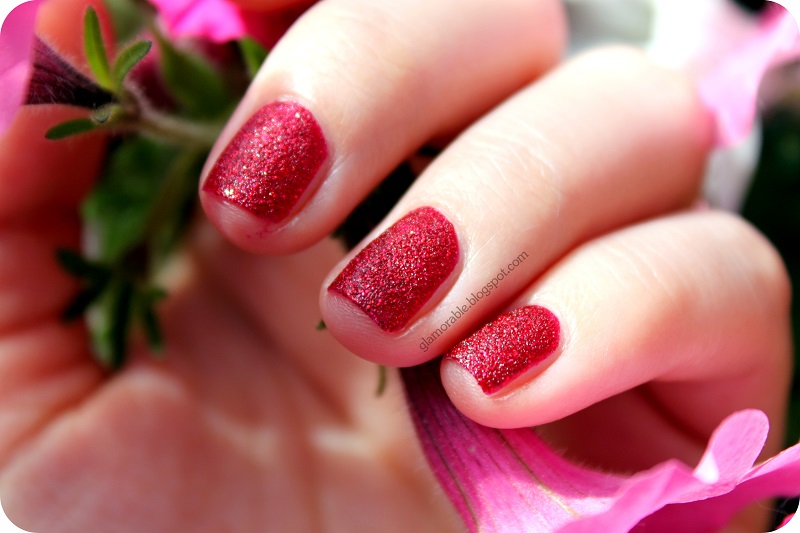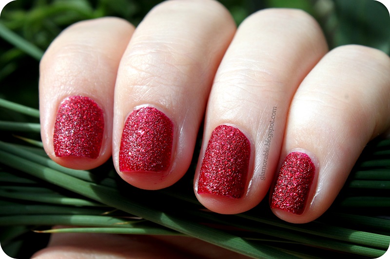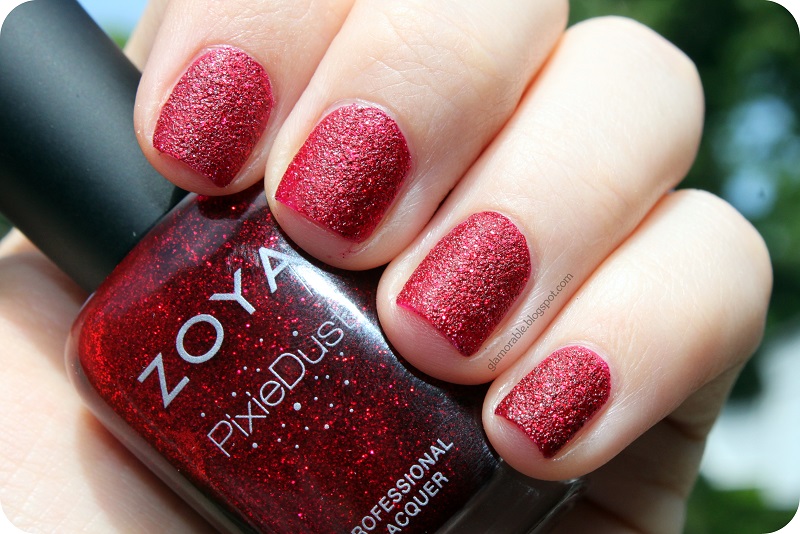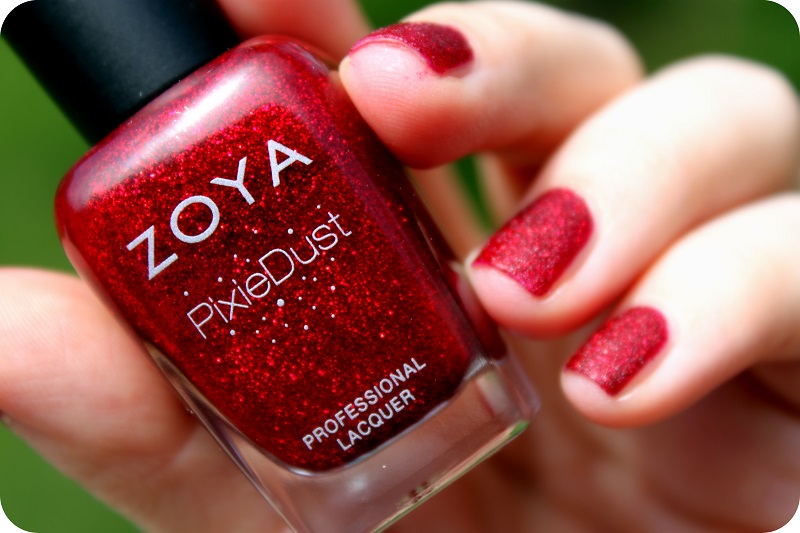 But, enough whining for now, because I’m presenting you this fabulous, gorgeous, fantastic color called Chyna from Zoya’s Pixie Dust collection – a crimson red silver sparkle with black undertones. As many of you know already, Pixie Dust is a textured nail polish collection from Zoya, similar to OPI’s Liquid Sand, but with much finer grains. Contrary to popular belief, these polishes don’t tug on sweaters or scratch the nylon stockings (tried and tested on both!) You are supposed to apply these either with no base coat, or with Zoya’s special base coat, and of course no top coat is necessary.