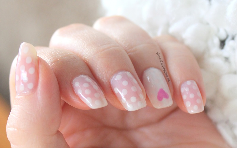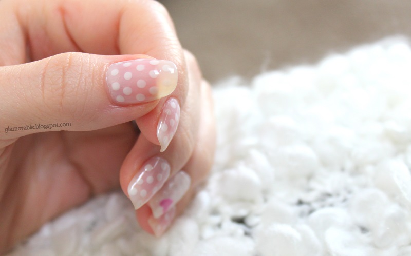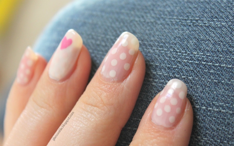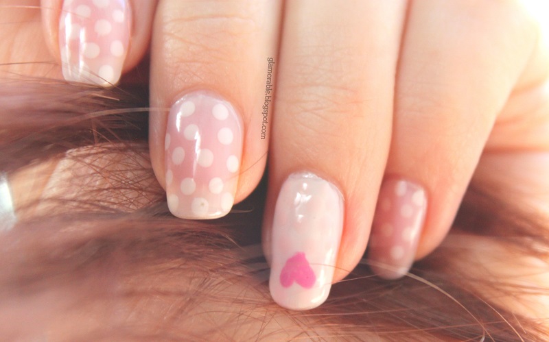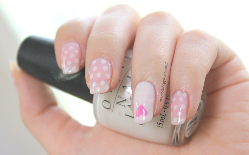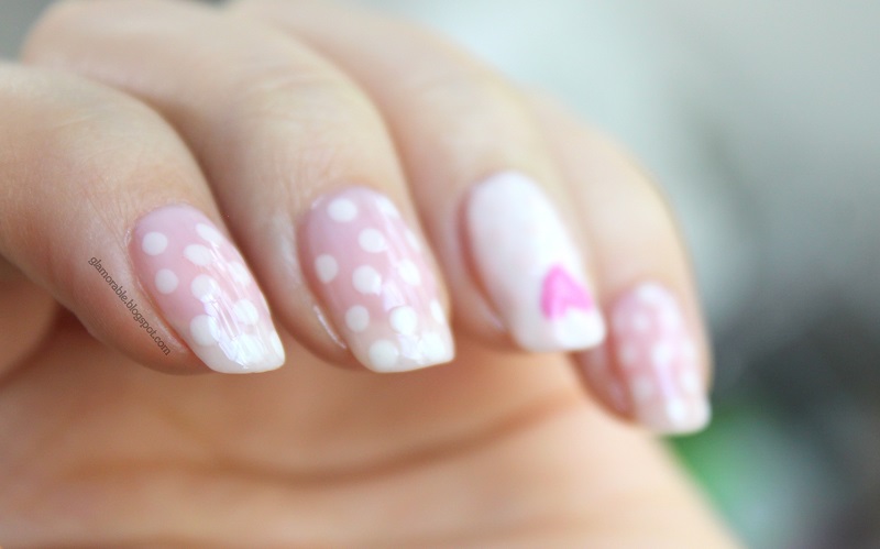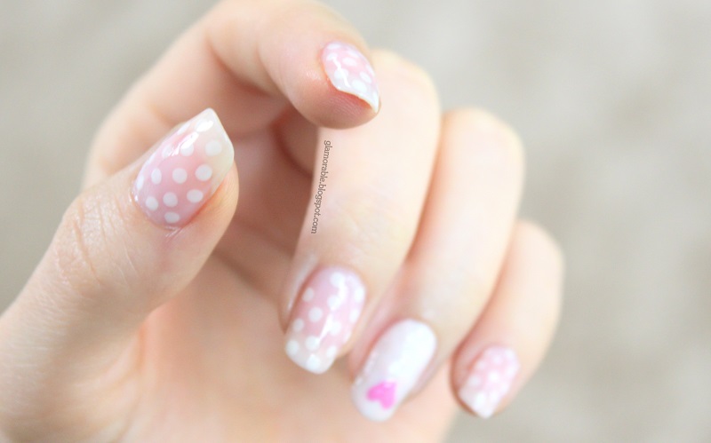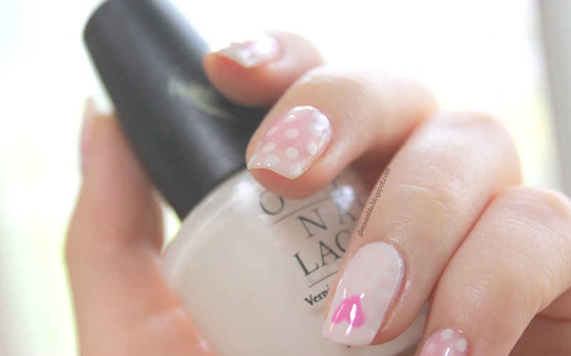 I started off by adding two layers of Dermelect Ridge Filler base coat and let it dry for about five minutes, after which I layered two more coats of Zoya Madison and one coat of Sally Hansen Insta-dri top coat. Then I let that “cake” sit for about 10 minutes to make sure I don’t smudge it. For the dots, I transferred a few drops of OPI Cream of Crete to a piece of paper, then dipped the rounded end of a bobby pin in it and carefully dotted my nails, making sure the dots are the same size and perfectly round. I painted my accent nail with OPI Cream of Crete all over, and drew a heart on my ring finger with Essie Cascade Cool. I finished off the mani by applying two more coats of Sally Hansen Insta-dri top coat and let everything thoroughly dry before doing and house work. Voila, my cute spring mani is done!