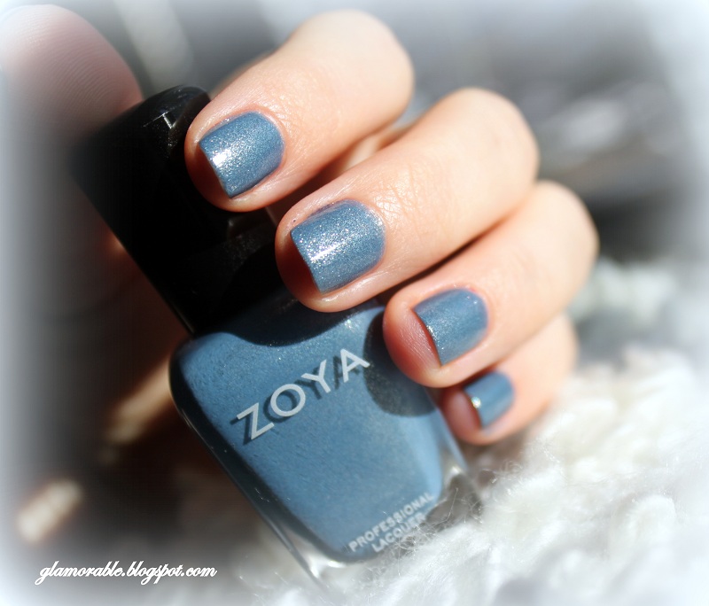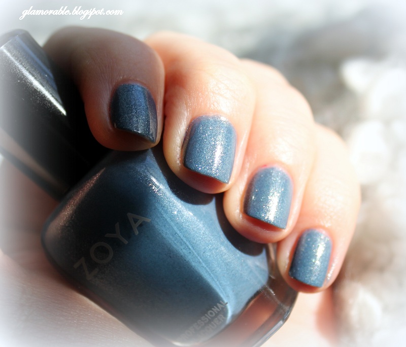 Here I am again with my belated and boring one-color Mani Mondays! This week I’m wearing Zoya Skylar. It’s a steel blue colored polish with a softened, dusty look and speckled by visible gold and silver shimmer flecks, and like all glitter polishes it has a slightly grainy finish. If you want it to be glossy you should put a layer or two of your favorite top coat. I didn’t use one, and this is how my mani ended up looking 🙂