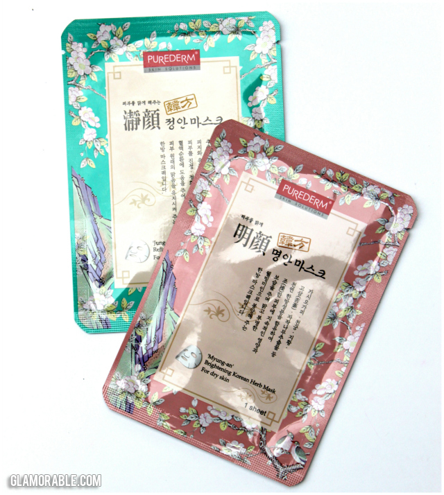 Purederm Korean Herb Mask – Can I just say that I like the packaging design of these masks? They look so pretty and traditional, with those pastel colors, and birds, and cherry blossoms. There were several variations of these masks sent out, and I received Refining and Brightening varieties.