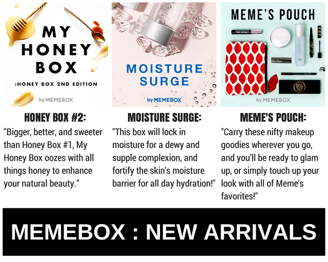 This week Memebox released several new boxes: Memebox Superbox #53 My Honey Box, Memebox Special #35 Moisture Surge, and Memebox Special #36 Meme’s Pouch.