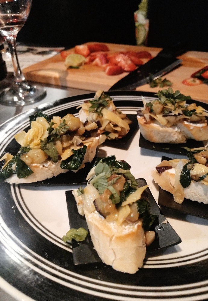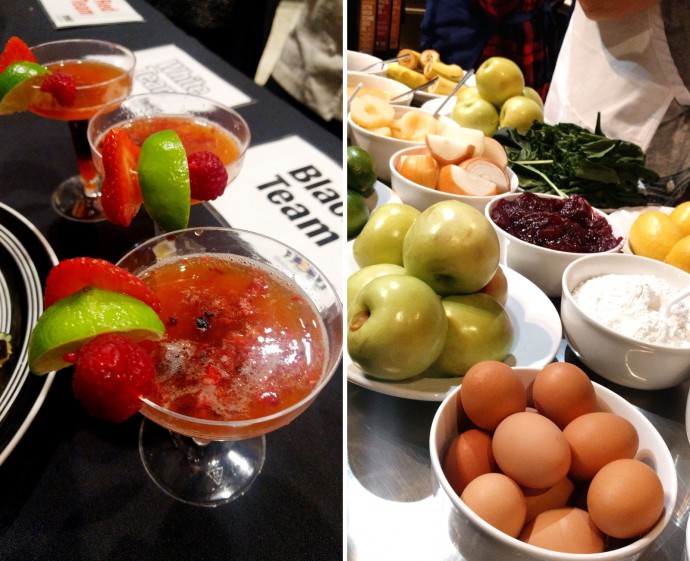 We ended up making garlicky zucchini-artichoke crostini with goat cheese and herbs. For our mocktail we chose to go with a berry-infused bubbly. It turned out great, even though we didn’t win. Everyone else did such an amazing job, too!