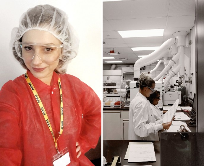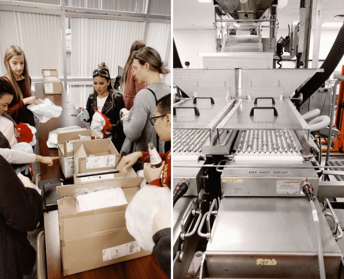 After the smoothie break we had about an hour to take a shower, get changed out of our sweaty gym clothes, and have a quick breakfast before hopping onto a bus and heading over to Bloomingdale for a plant tour. When we arrived to the facility, everyone was given a pair of gloves, a special protective coat, glasses, a hair net, and shoe covers. We pretty much all looked the same so it was hard to tell who is who, haha!