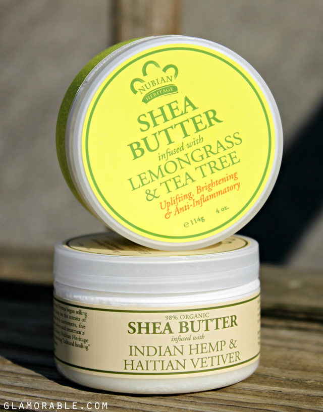 Last week I told you about Nubian Heritage Hand Cream I’ve been loving lately, and today I thought I’d bring up one of their best-selling products – jars of pure organic Shea Butter infused with natural oils and oil blends. They come in many different scents, and I got to try two of them: Lemongrass & Tea Tree and Indian Hemp & Haitian Vetiver.