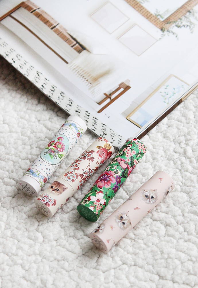 While the fancy plastic case above is permanent, there are also five new Paul & Joe Lipstick Case CS ($9) paper cases to choose from. Paul & Joe often releases featherweight limited edition cases that allow you to have fun with your makeup packaging. If you are someone who prefers everything to be super minimal then you probably won’t be interested in these, because the designs are usually very cutesy and girly, with a vintage twist. This spring Paul & Joe dressed the cases in the adorable romantic patterns, with lots of pinks, pastels, and some bright sunny colors. The pink one with white kitties is my favorite, of course!