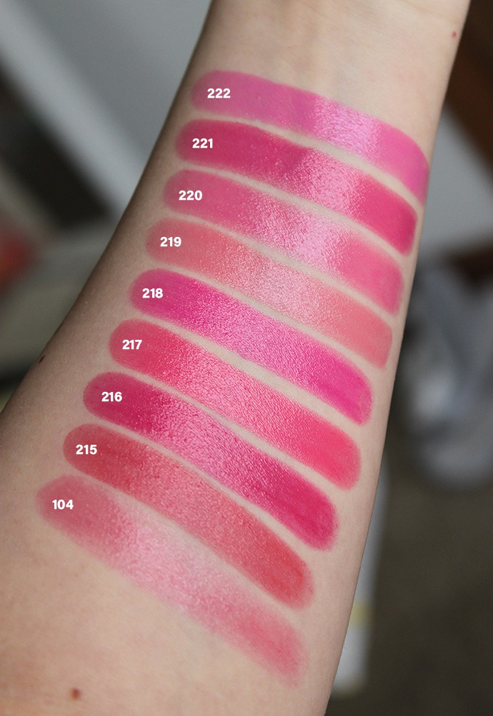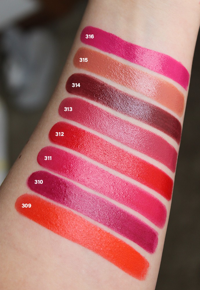 Full coverage shades performed the best on me. They all applied evenly, easily stayed on for at least 4-5 hours, and survived a few drinks and a salad without any touchups. They don’t emphasize dry spots, and the formula feels weightless so you’re not constantly aware of your lips. If you can only get one Paul & Joe lipstick, pick a shade that starts with 300 – you won’t regret it!