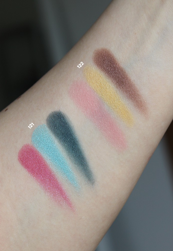 The powder texture varied slightly between the shades: some were more pigmented than others, and some were stiffer, and more firmly pressed into the pan. The “sun” pans performed the best and offered a more intense color payoff, while the “cats” and the blush backgrounds were a little more muted. Building up the color was very easy, but I thought the blending could be better – this formula sticks to the skin too well. On my slightly oily lids, none of the shades creased at all, the color didn’t even fade at the end of the day.