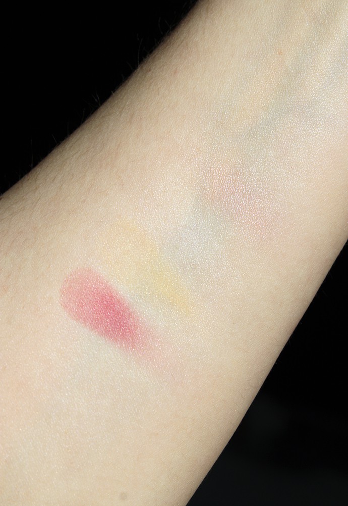 Face Powder Limited 001 comes in a darling paper compact and contains seven little color-correcting “petals”. It’s meant to be sheer with a slight peachy-rosy tint so it took me several swipes to get swatches of individual petals – they are nowhere near that pigmented if you use the powder as directed. It gives the skin a warm radiant glow, lightly color-corrects the skin tone, and helps set makeup in place. The powder also smells like neroli water, Paul & Joe’s signature fragrance.