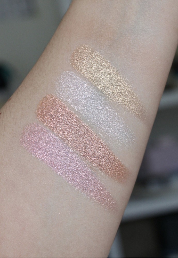 Swatches from Top to Bottom: Physicians Formula Butter Highlighters in Champagne, Pearl, Rose Gold, Pink